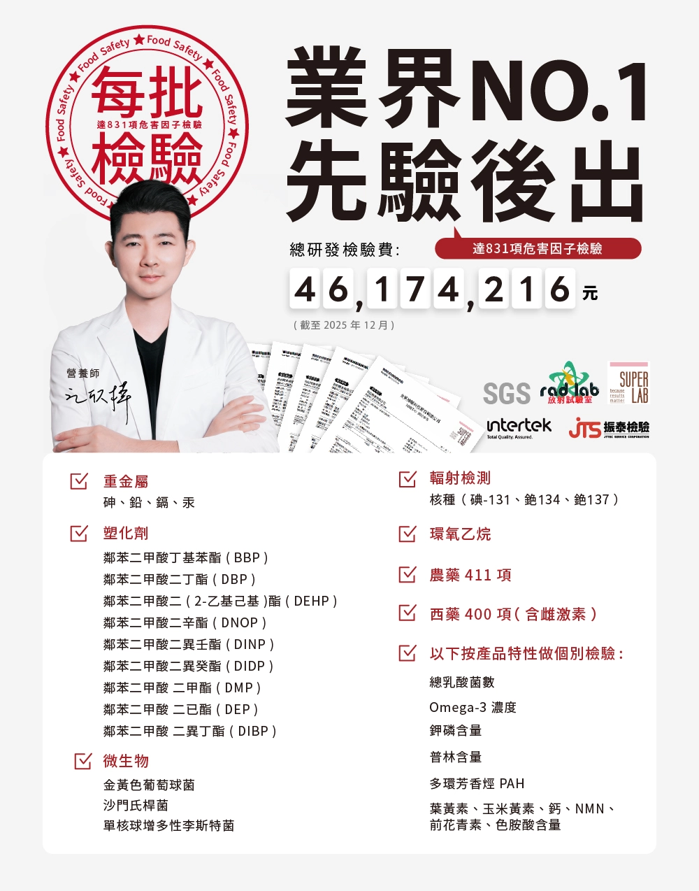 在食安不斷的今天,我們是業界 N0.1 先驗後出的公司,高達 831 項檢驗(重金屬、塑化劑、微生物、核輻射、環氧乙烷、農藥、西藥等),通過才出貨,至今,總研發檢驗費已高達 4090 萬元。